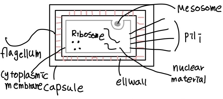 마이코플라즈마를 제외하고는, 세균들은 capsule(존재할 수도 있고 없을 수도 있음)과 세포막(cytoplasmic membrane)에 의해 구성된 cell envelope에 둘러쌓여있다. 세포막 내의 세포질에는 다양한 과립, ribosome, 핵양물질(nucleoid), mesosome이 포함되어 있다. 몇몇 박테리아는 편모(flagella)를 가지고 있으며, 그람음성 세포중 몇몇은 섬모(pili)나 fimbriae(sex pili)를 가지고 있다. 세포막은 얇고 탄력적이며 인지질2중층으로 이루어져 있다.